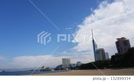 從百道濱海灘看到的藍天、白雲和住宅區 / 福岡市百道濱