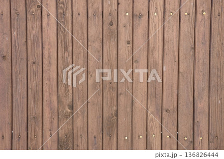Full-frame view of vertical wooden planks with visible grain, knots and metal nails,