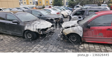 Burned and severely damaged cars parked in a lot after a fire incident.