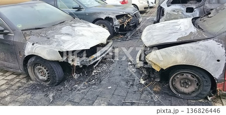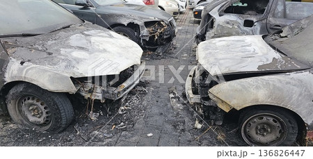 Front view of four fire-damaged cars with melted hoods and shattered windows