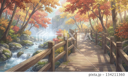 秋日景色,一條健行路線,碎石小路和一座簡易木橋橫跨山坡。