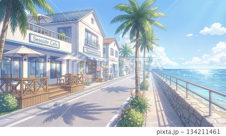 一條燈火通明的海濱度假街道,兩旁林立著咖啡館和紀念品商店。