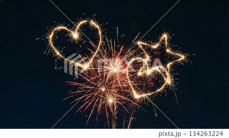 夜空中閃耀著心形和星形的煙火