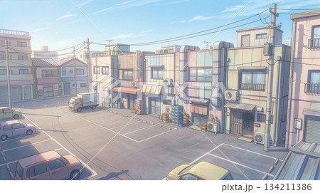 從低空鳥瞰視角看到的購物街後面的安靜停車場