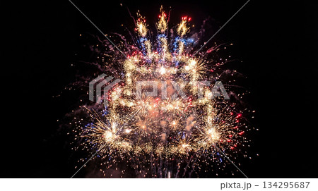 生日蛋糕形狀的煙火在夜空中閃耀