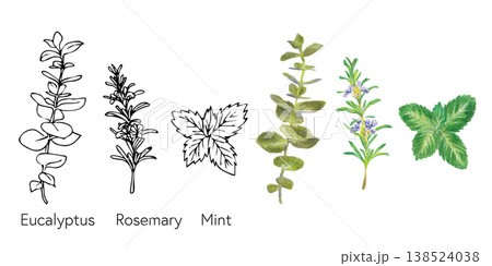 手繪尤加利、迷迭香和薄荷藝術作品 | 線條藝術和彩色鉛筆草本植物套裝