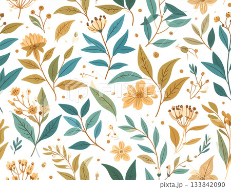 以藍色和金色花朵和葉子為特色的植物圖案背景。