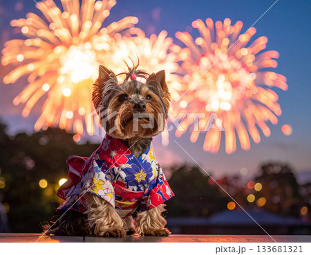 約克夏犬穿著浴衣,夏夜的天空中綻放著煙火