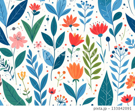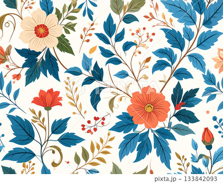 以藍色葉子和紅色花朵為特色的植物圖案背景。