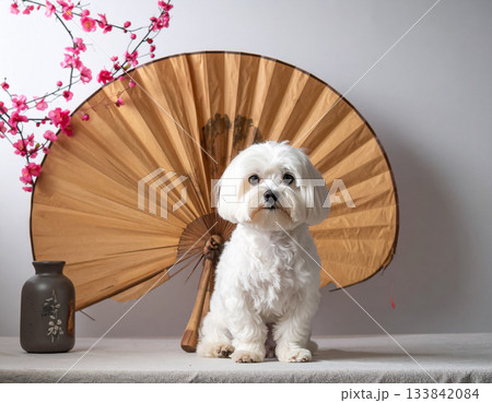 一幅馬爾濟斯犬的肖像,周圍環繞著日式傘和梅花。