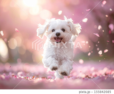 笑容燦爛的馬耳他犬在櫻花花瓣間奔跑