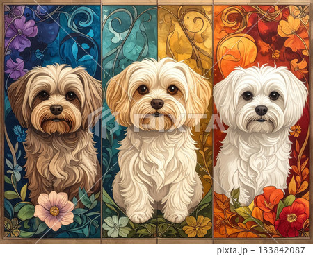 三隻以鮮花環繞的馬爾濟斯犬為主題的裝飾藝術品