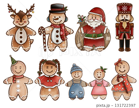 Watercolor Christmas Gingerbread Character Set with Santa, Reindeer, Snowman, and Nutcracker Illustration