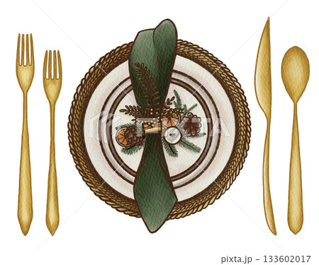 Watercolor Illustration of Gold Cutlery Set Isolated on White Background
