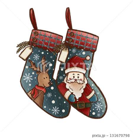 Watercolor Christmas Stockings with Santa Claus and Reindeer Illustration Isolated on White Background