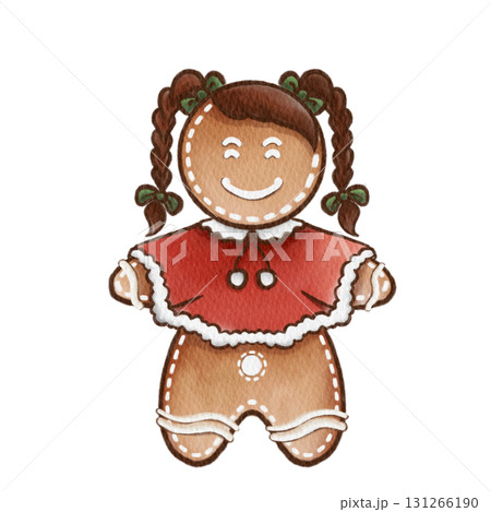 Cute Watercolor Gingerbread Girl Cookie with Braided Hair and Red Christmas Dress