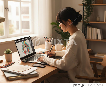 一位女士正在筆記型電腦上創作插圖
