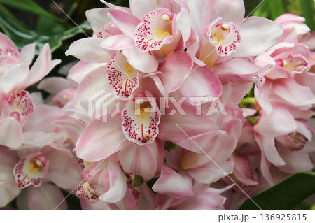 白色和淡粉色的蘭花成簇優雅地盛開