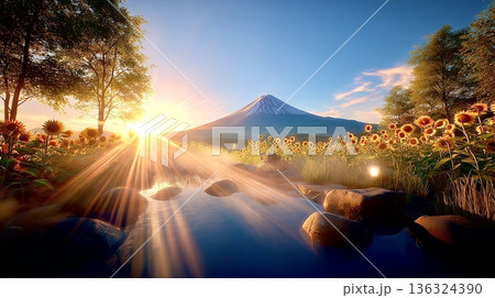 富士山和向日葵溫泉村沐浴在晨曦之中