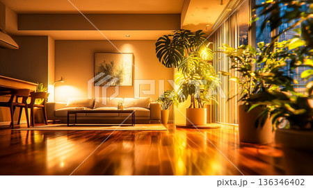 夜晚,綠意盎然的客廳,四周環繞著柔和的燈光。