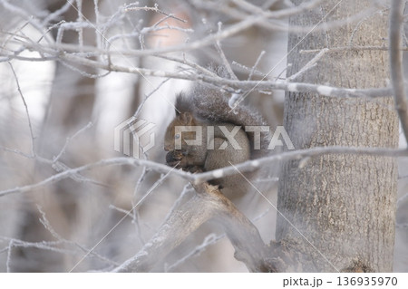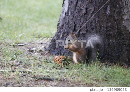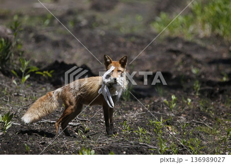一隻紅狐狸嘴裡叼著塑膠垃圾