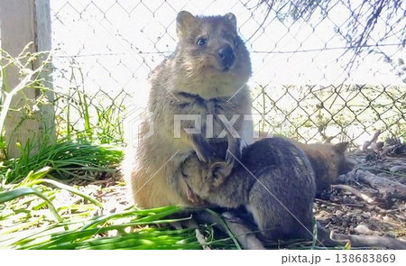 一隻母短尾矮袋鼠正在哺育幼崽,可以看到幼崽的臉。