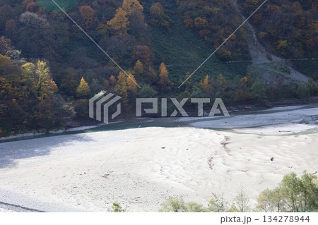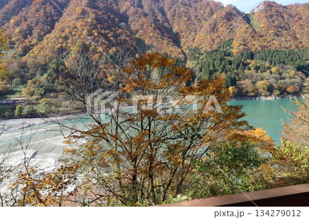 從電車上望去,黑部川河岸和山巒被秋葉染成了五彩斑斕的顏色。