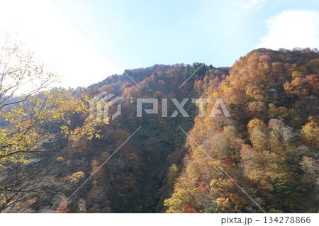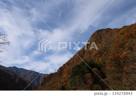 黑部鐵道:從電車上拍攝的秋葉染紅的山巒和天空
