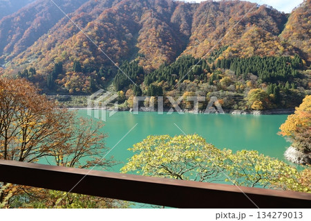 宇奈月溫泉的山巒被秋葉染成一片絢麗,河流也呈現鈷藍色。