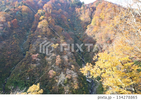 秋葉染紅了橫跨宇奈月溫泉群山的紅色橋樑。