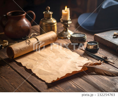 Blank parchment surrounded by vintage explorer tools and scrolls