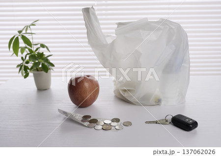 日本硬幣和塑膠袋分別代表儲蓄、家庭管理和購物。