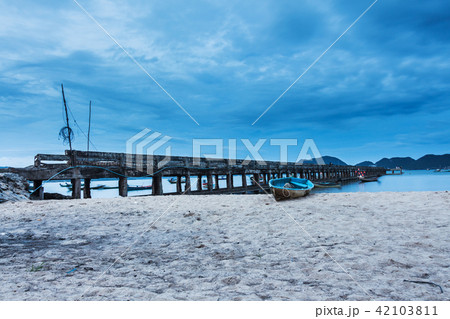 Wood terrace against beautiful seascape at sunset