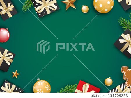 Merry christmas and happy new year greeting card banner with gifts and decorations.