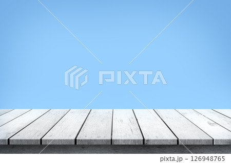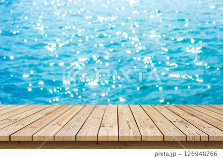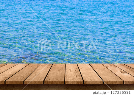 Empty wooden table top with blue sea summe background, used for display or montage your products.
