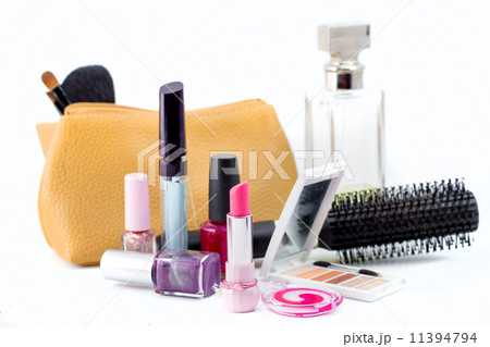 cosmetics isolated on white background. Pink lipstick, mascara,