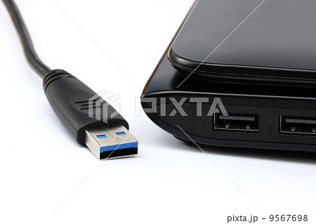 USB cable isolated and port USB notebook on white background