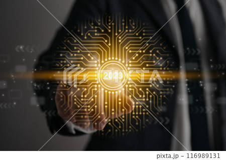 Businessman Touch Screen and 2023 New Year Icon in Vintage Tone