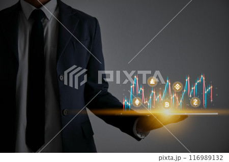 Businessman Hold Tablet and Color Stock Market Graph and Cryptocurrency