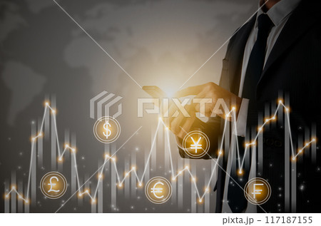 Businessman Hand and Finger Press or Touch Center Stock Graph and Money Currency