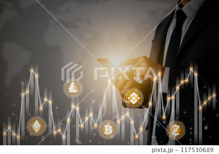 Businessman Hand and Finger Touch Mobile Phone and Stock Graph and Cryptocurrency