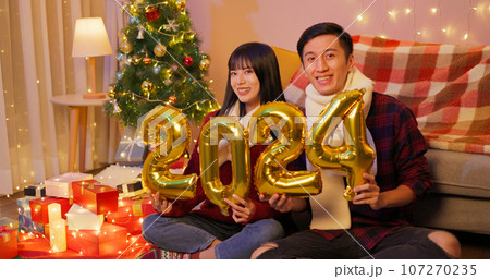 couple decorate xmas tree