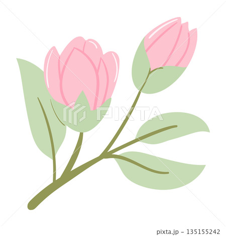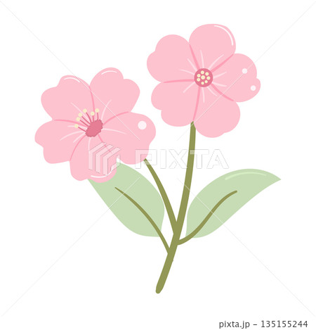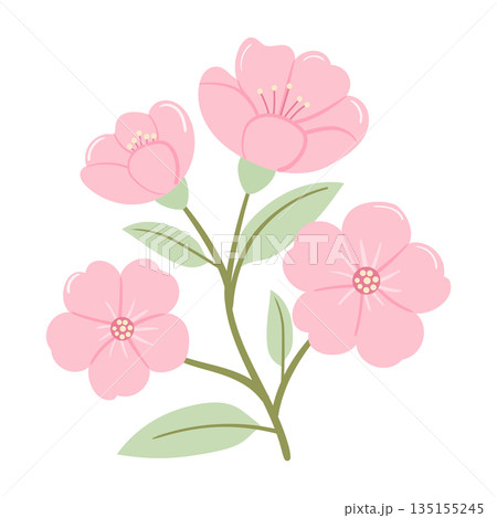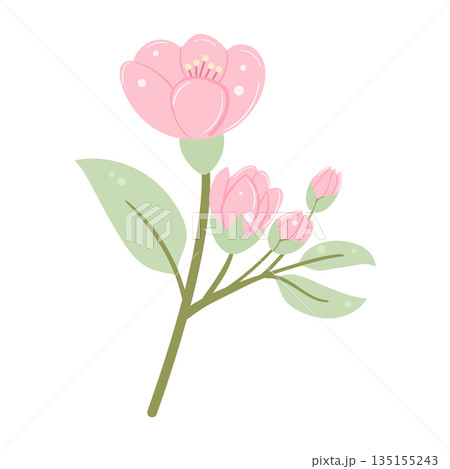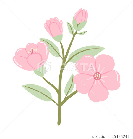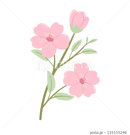 Pastel Cherry Blossom, Bloom and Green Leaves Hand-Drawn