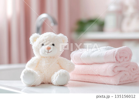 Baby bath accessories, bottles of shampoo with teddy bear and pink towels
