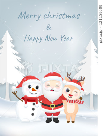 Cute santa claus, snowman and deer in winter, Christmas season illustration.