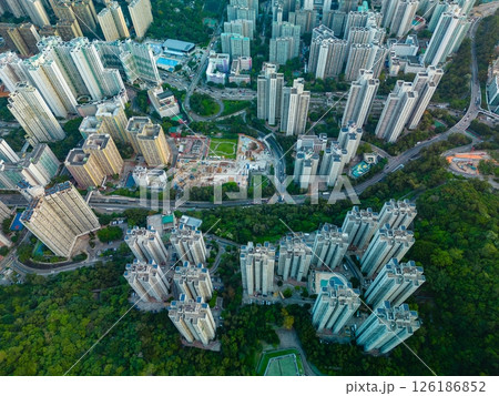 Vertical high angle aerial view of high rise apartment in Hong Kong