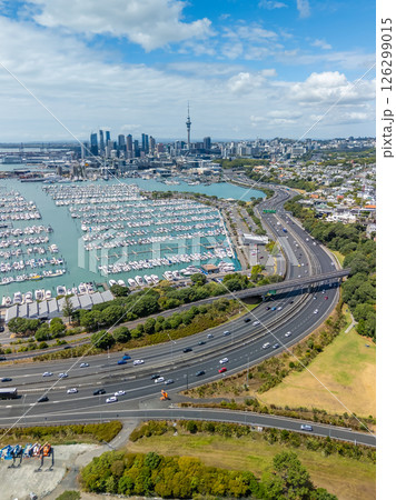 Aerial view of Brisbane city and highway traffic in Australia in daytime