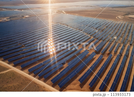 A vast field of solar panels under the intense gaze of the sun. Clean energy generation and technology.