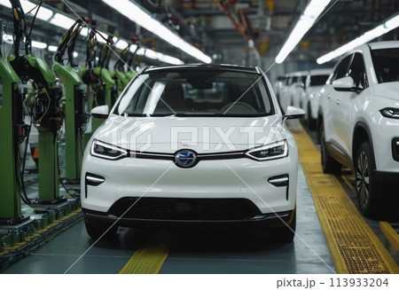 A car assembly line with a focus on electric vehicles. The industry's move towards eco-friendly options.