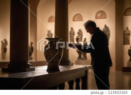 A visitor in a museum admires an ancient vase, reflecting on history. The soft lighting enhances the artifact's details.